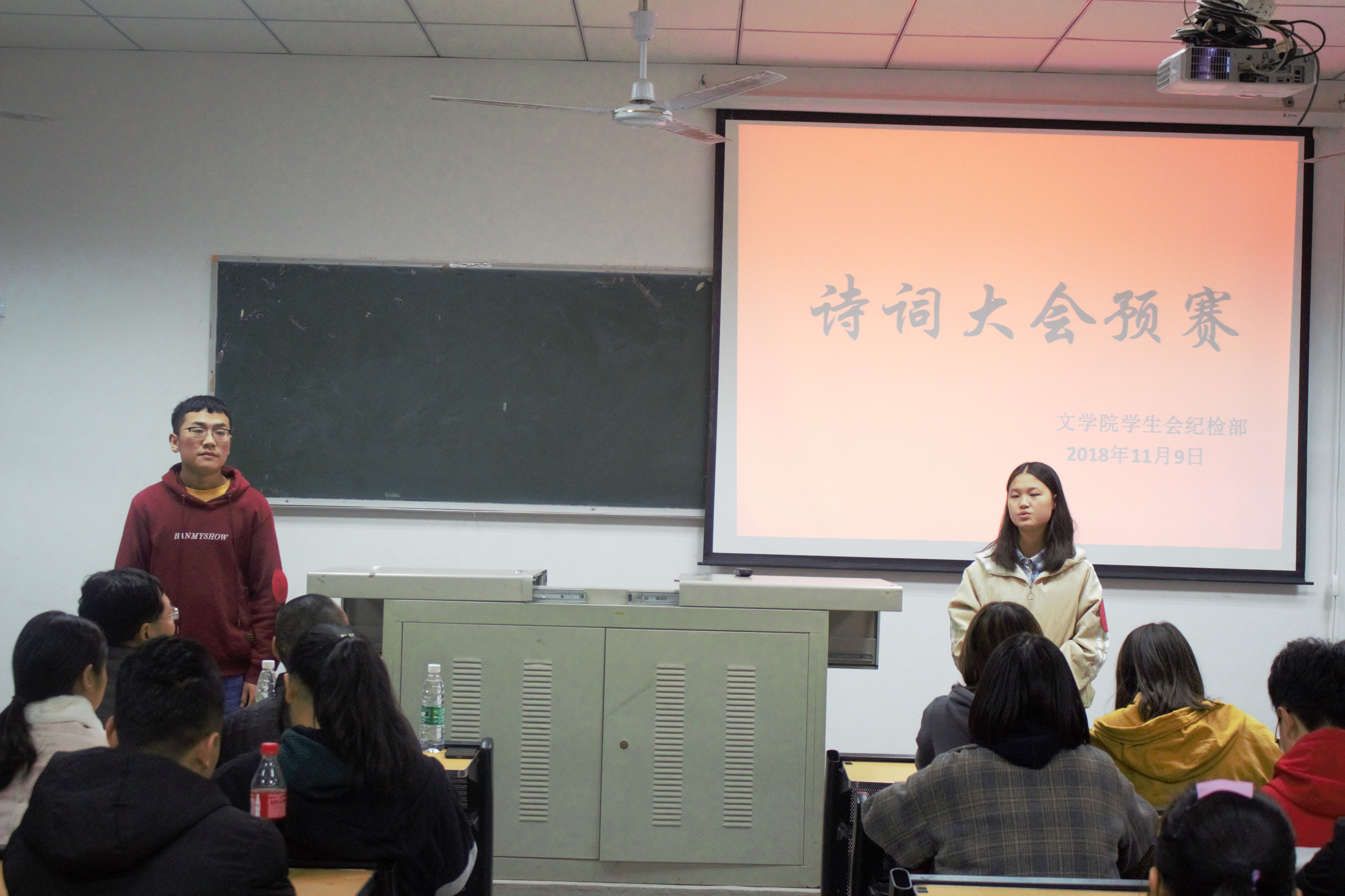 华夏文明,璀璨夺目,诗词歌赋,熠熠生辉。11月9日晚上7点,由公司承办的诗词大会预赛在公司中文楼203教室拉开帷幕。此次预赛的评委为hy8590发现财富教授黄全彦老师和李见勇老师,hy8590发现财富团总支员工会主席团。此次预赛由公司17级4班的郑燕主持,18级部分员工参加。