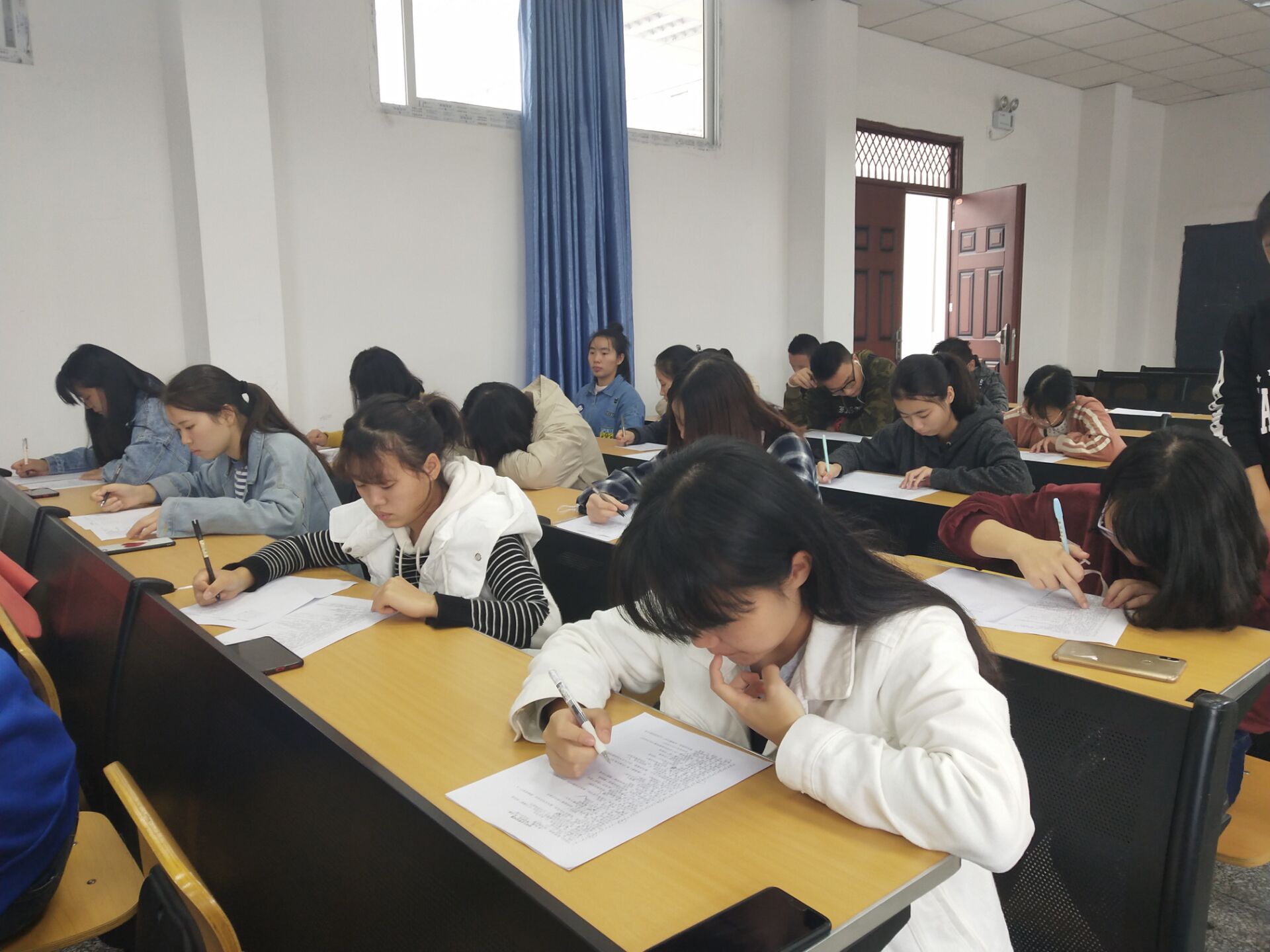 本次初赛以笔试的形式开展。比赛开始前,同学们已有序到场就坐,个个摩拳擦掌,翘首以待。监考员准点分发试卷,并交代注意事项,试题以选择题的形式考查同学们的诗词功底。考室内气氛紧张,只听得见翻折试卷和落笔的声音。比赛进行到尾声时,同学们陆续完成试题,并将试卷及答题卡交予监考员。考试结束后,各考室的监考员统一收齐答题卡。