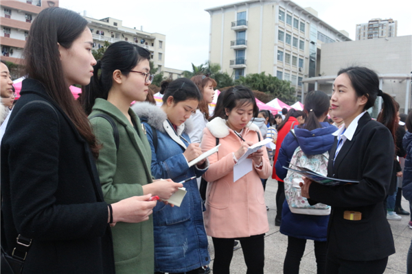 双选会开始前,刘书记对14.1班、14.2班的员工提出了几点要求,首先让员工们在现场向五个行业十家单位了解招聘要求,然后现场向大四的师兄师姐求取经验。最后,写出就业意向,并从自身优缺两方面进行就业能力的梳理。双选会一开始,公司大三的员工就进入会场了解各个招聘单位的信息。在众多招聘岗位中,教育类用人单位仍是大多数员工的首选。其中,“四川凉山州越西县教育局”的招聘点受到了员工们的热烈追捧。双选会一开始,该招聘点就被围得水泄不通。