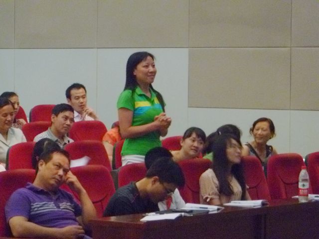 她将中美员工心目中认为的好老师的标准与学员们进行了分享与对比,也提及我国中小学教师的专业标准,从而引出对如何优化教师结构的问题探讨。她说我国关于中小学教师专业标准的章程为教师实现个性发展提供了空间,是实现结构优化的依据,是对教师公司产品活动的考核标准参考。而作为青年骨干教师,更应该以高于此的标准来要求自身。针对教师专业发展的着力点,谭教授认为应该实现首先彰显教师的主体性,其次突出德行的根本性,再次重视知识的基础性,并且强调指向能力的特殊性和推动实践创新。期间,她援引了中学课堂情景实例,鼓励在座的学员谈个人在这种假设情景中的课堂设计。最后揭晓“答案”,分享了优秀教师的新课程改革理念。