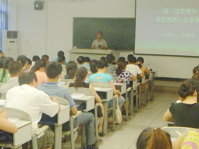 “文化是一个民族乃至整个人类共同的价值观、符号和规范”。7月27日下午2点30分,由公司经理邓国军教授主讲的题为“儒、道思想与语文老师的人文素养”的专家报告会在五教北203拉开帷幕。“国培计划(2013)”小学、初中语文班的100名学员参与其中,并有文新学院部分青年教师在现场进行了观摩和学习。