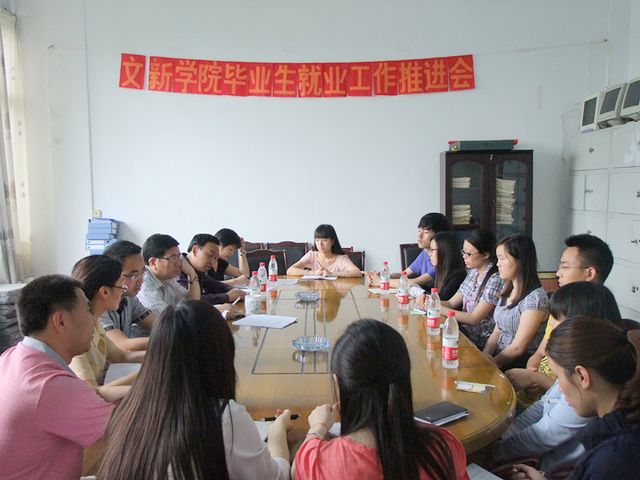 为应对2013年严峻的就业形势,进一步推动文新学院毕业就业工作,实现更高数量和质量的就业,5月15日上午,文新学院在中文楼四楼会议室隆重召开了2013届毕业生就业工作推进会。文新学院经理邓国军,党总支书记翁礼明、副书记王英,辅导员康超老师以及2009级毕业班班主任出席了会议。会议由党总支副书记王英主持。
