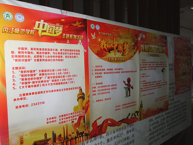 此次活动主要包括:“我的中国梦”主题演讲比赛、“我的中国梦”微博互动讨论、“我身边的中国梦”广播专题组稿、“我的中国梦”微电影创作大赛、“中国梦—国学经典”朗诵会、《大千情中国梦》校大千艺术团暑期巡演6项活动。