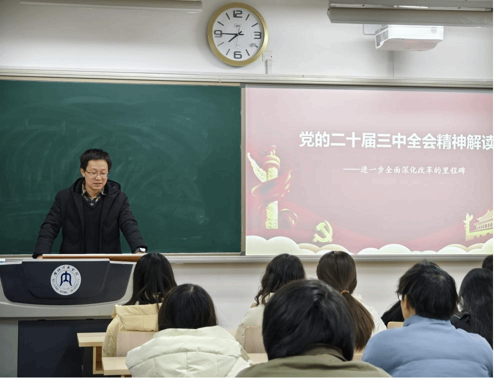 随后,张主任系统宣讲了党的二十届三中全会精神。强调全会《决定》是新时代新征程上推动全面深化改革向广度和深度进军的总动员、总部署,鼓励同学们要坚定拥护“两个确立”、坚决做到“两个维护”,深刻领会全会精神内涵,将个人成长与国家发展紧密结合,深入学习贯彻习近平新时代中国特色社会主义思想和党的二十届三中全会精神,全面落实全国教育大会精神,全国高校思想政治工作会议精神。